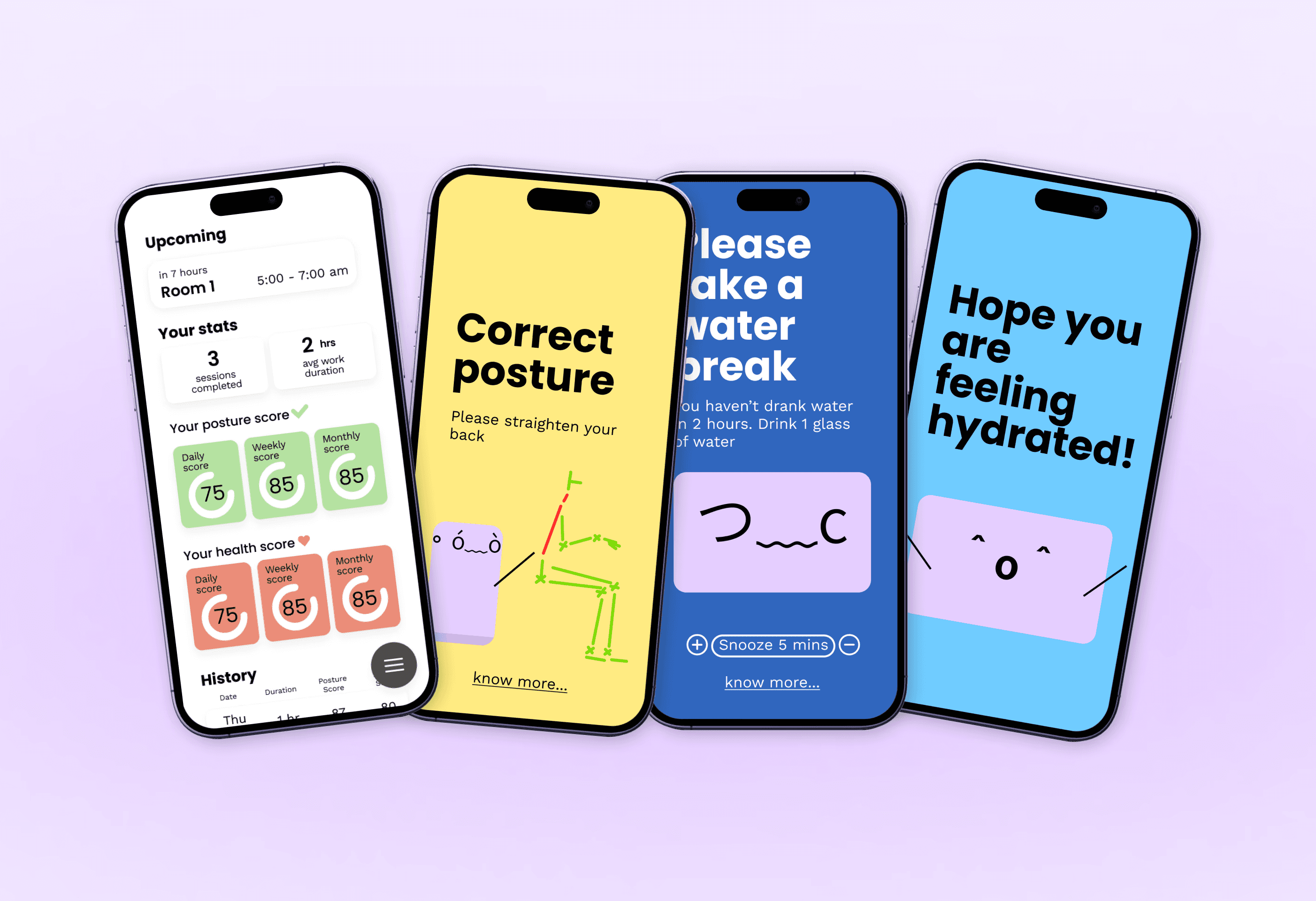 The final system delivers posture monitoring through playful, non-invasive interactions. By combining real-time skeletal tracking with adaptive behavioral nudges and emotional avatars, the design transforms health monitoring from clinical surveillance to supportive companionship.