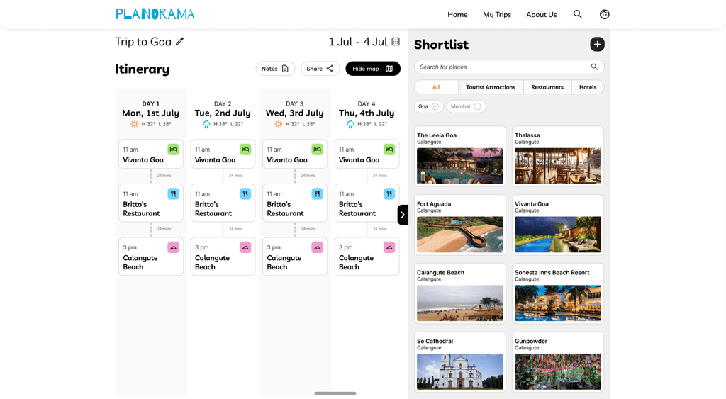 I created a modular design system with repeating components. The place cards used consistent patterns whether they appeared in search results, the itinerary, or the shortlist. This made development faster and ensured visual consistency.
