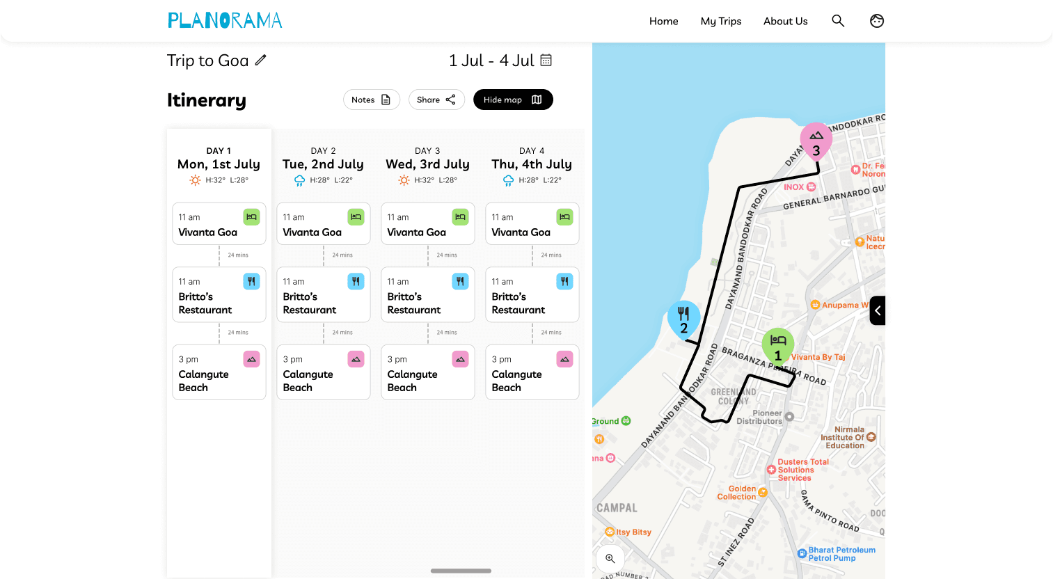 One of the core design challenges was helping users visualize their daily route. Travelers need to see locations spatially to plan efficient days and avoid backtracking across a city.