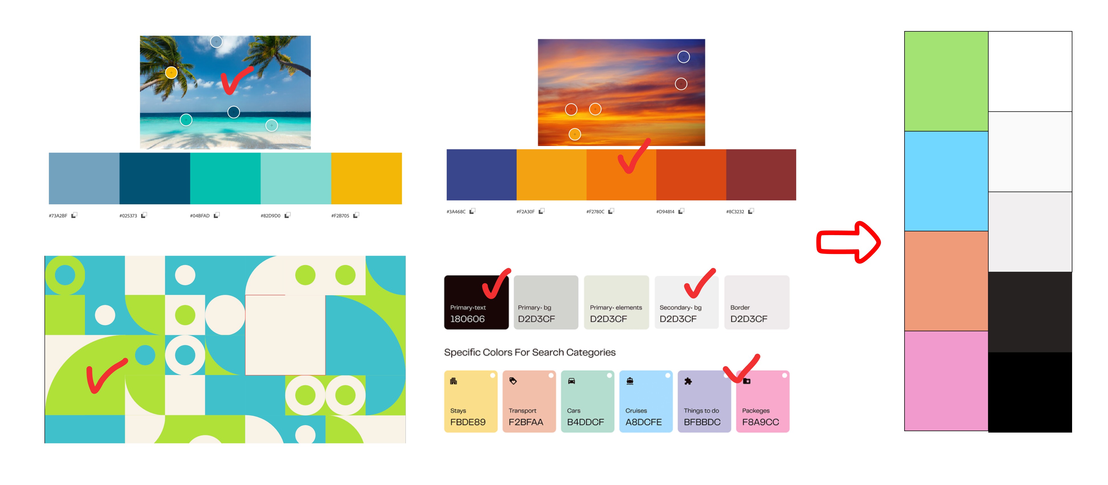 I chose a sunset-inspired palette with warm oranges, soft pinks, and vibrant accent colors. The rationale was simple: travel is about discovering the colors of new places. The palette needed to feel energetic and optimistic without overwhelming the interface. I went through several color iterations, testing different combinations against the wireframes. Some versions felt too playful and lacked professionalism. Others felt too corporate and drained the energy.