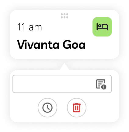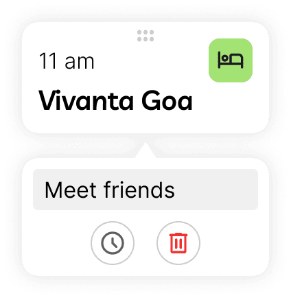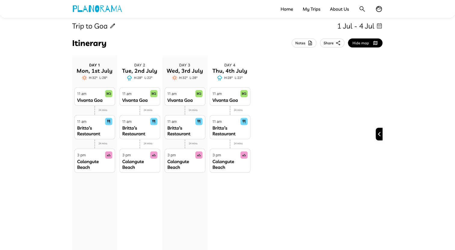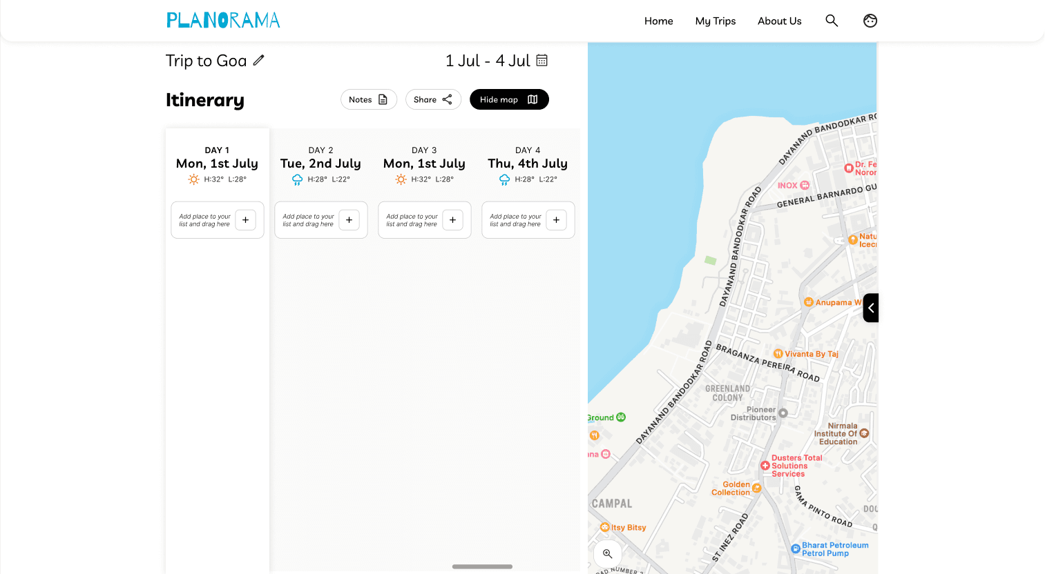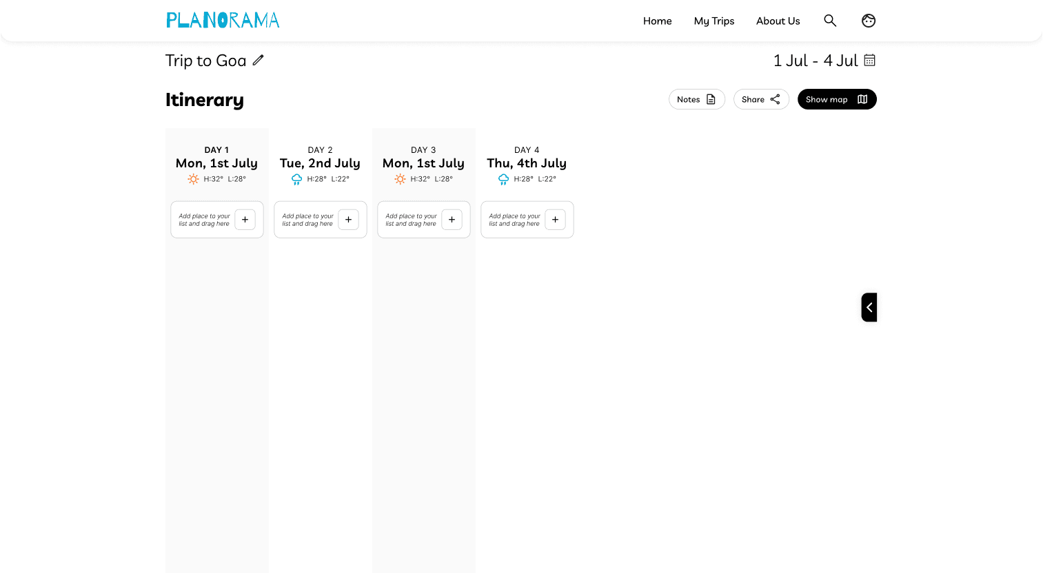 In the collapsed state, place cards show essential information: name of place and time allocated. When clicked, the card reveals the notes field along with more description. This progressive disclosure kept the interface clean while making deeper functionality accessible.