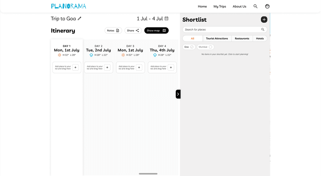 Empty states are often overlooked, but they're the first thing new users see. If the empty page looks broken or confusing, users lose confidence immediately. I prioritized designing thoughtful empty states for every section. When users first create a trip, they see a welcoming screen that explains what to do next. When the itinerary is empty, clear prompts guide them to start searching for places.