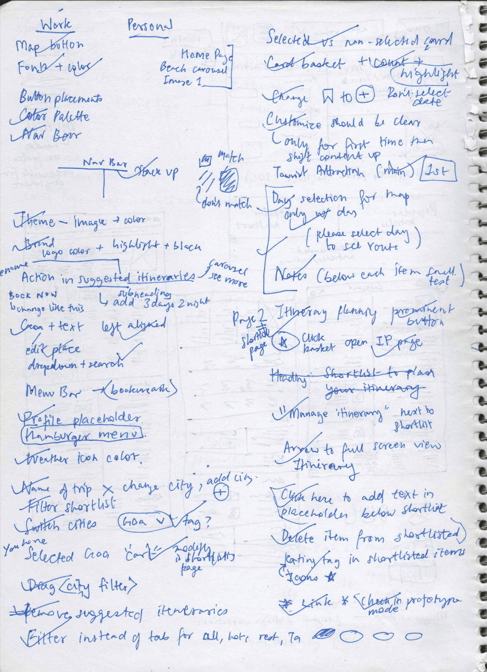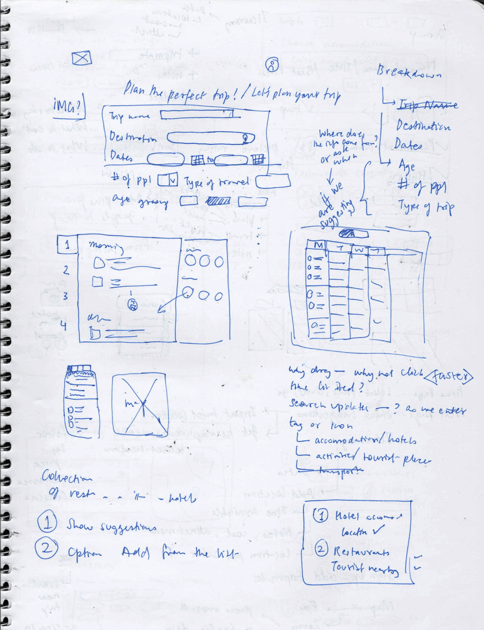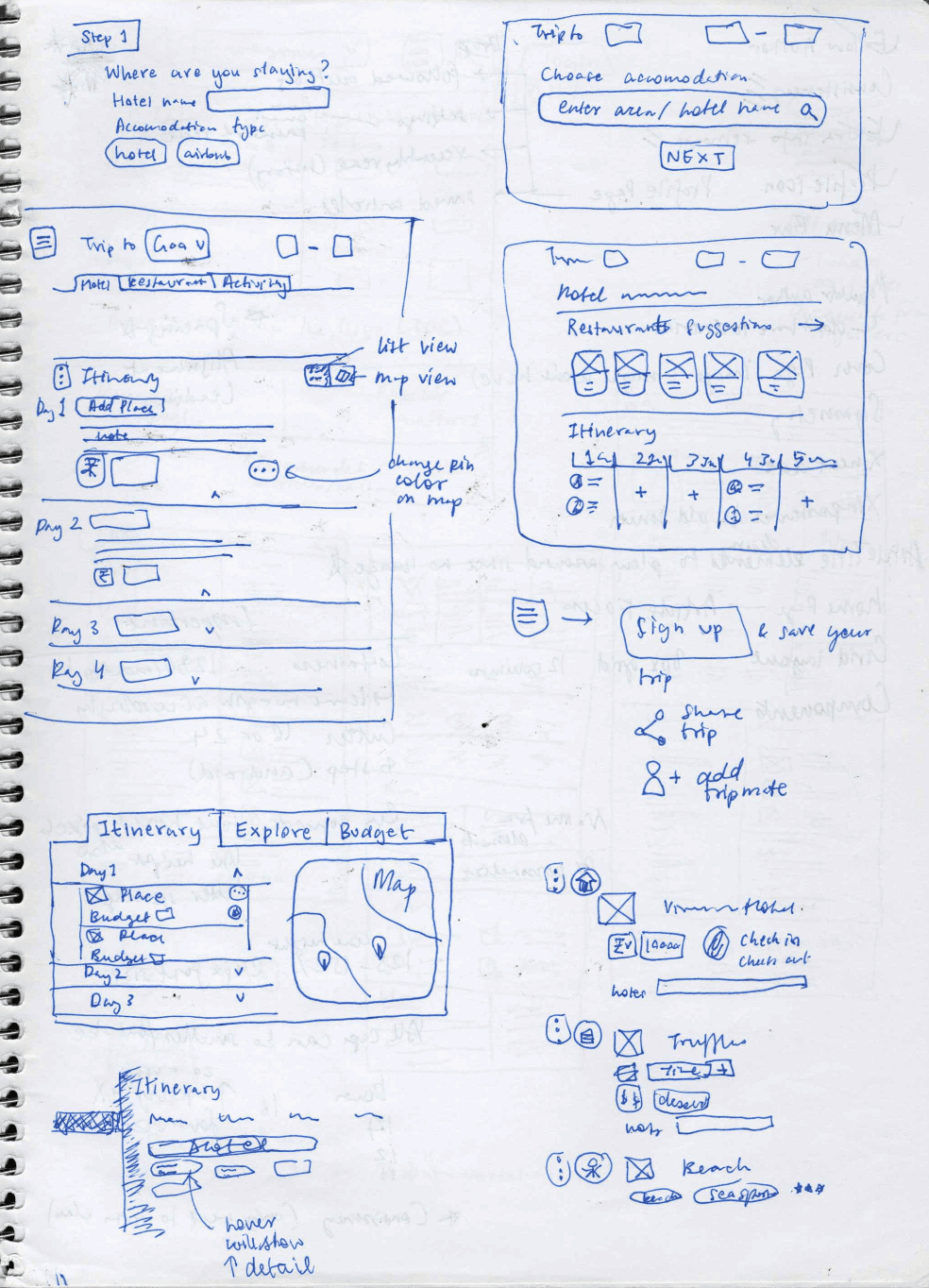 I started with low-fidelity drawings to explore different approaches quickly. The goal was testing ideas before committing to pixel-perfect designs. Early wireframes focused on the core interaction: how users move places from search results into their itinerary. I sketched multiple variations, sharing them with senior designers for feedback.