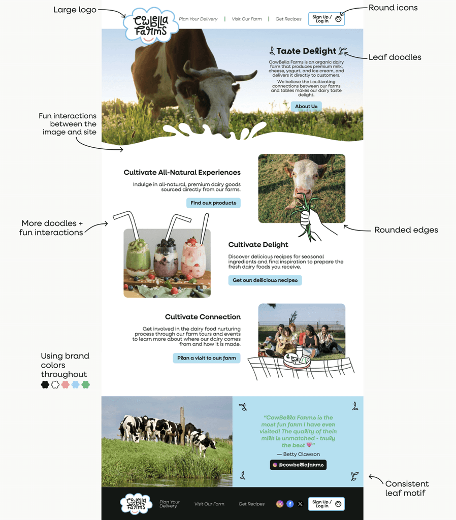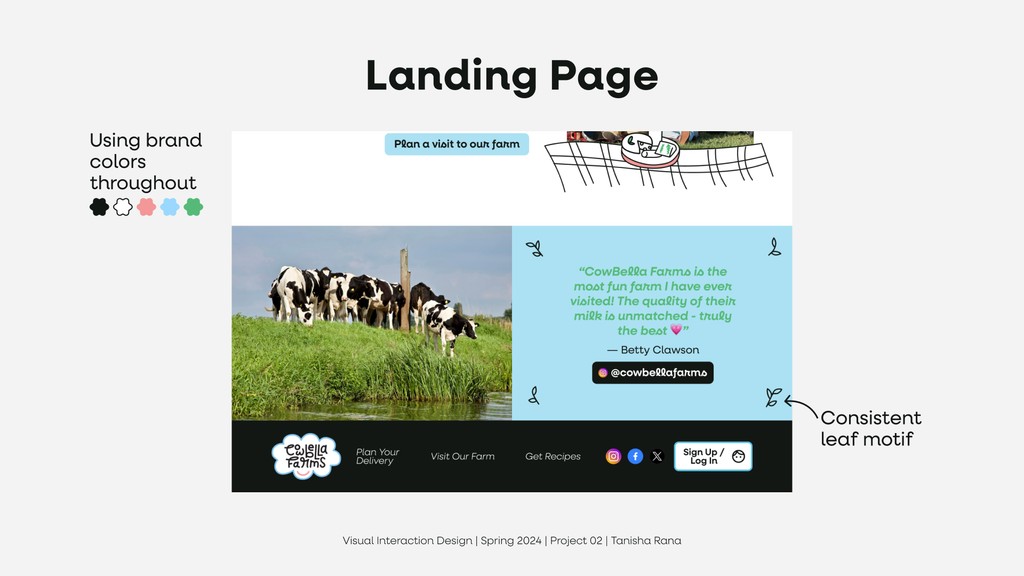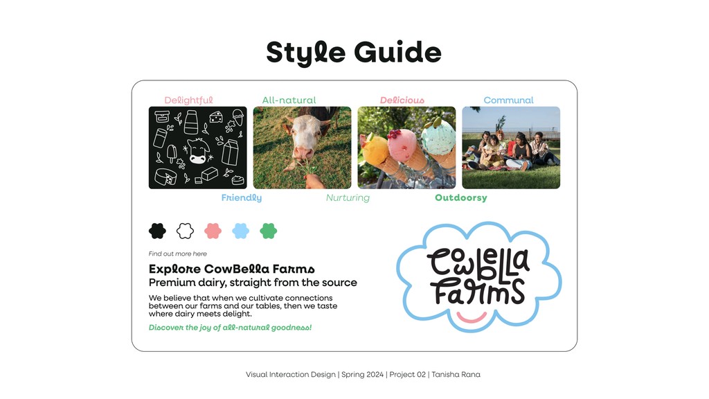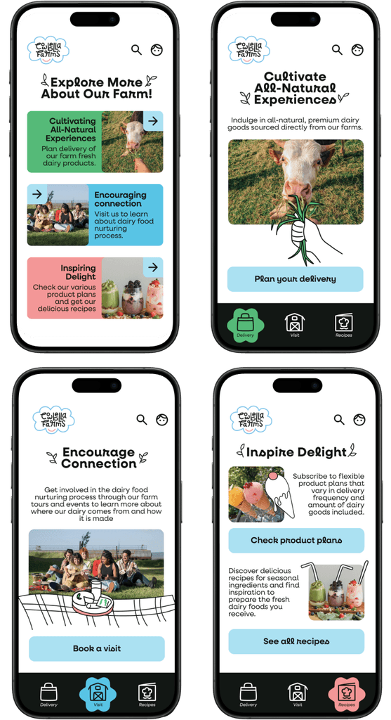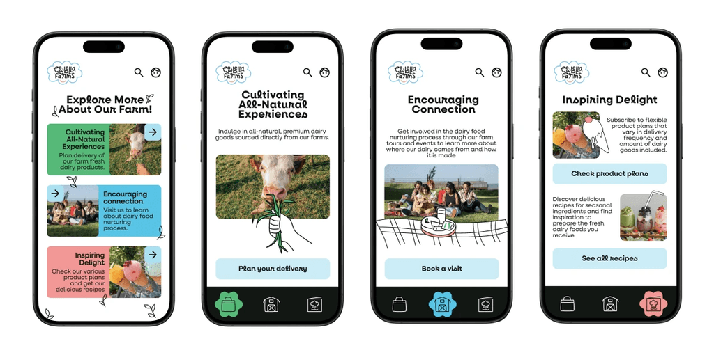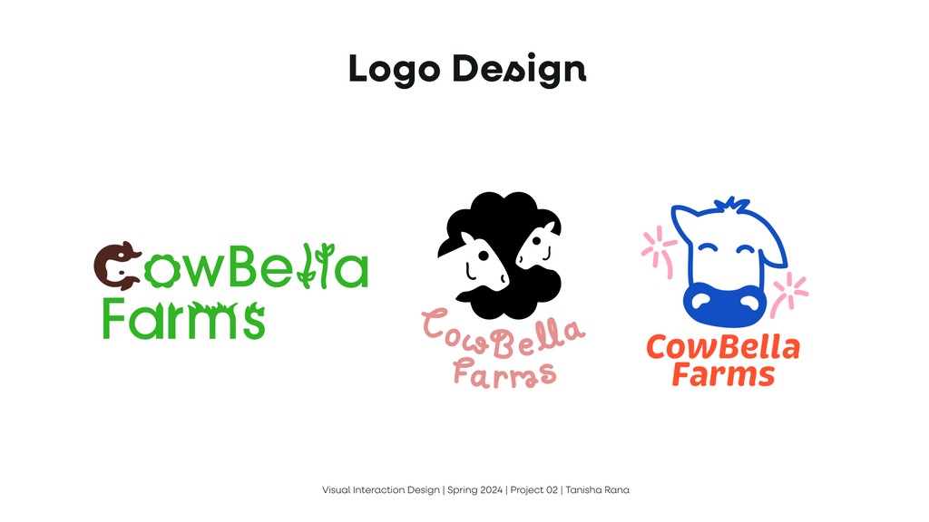 To design a new visual design system, including a logo, typography, color palette, and UI elements, that reflects CowBella Farms’ ethos of being all-natural, communal, and delightful. The goal was to ensure the brand identity resonates across various online & print channels, such as posters, mobile screens, and a website landing page.