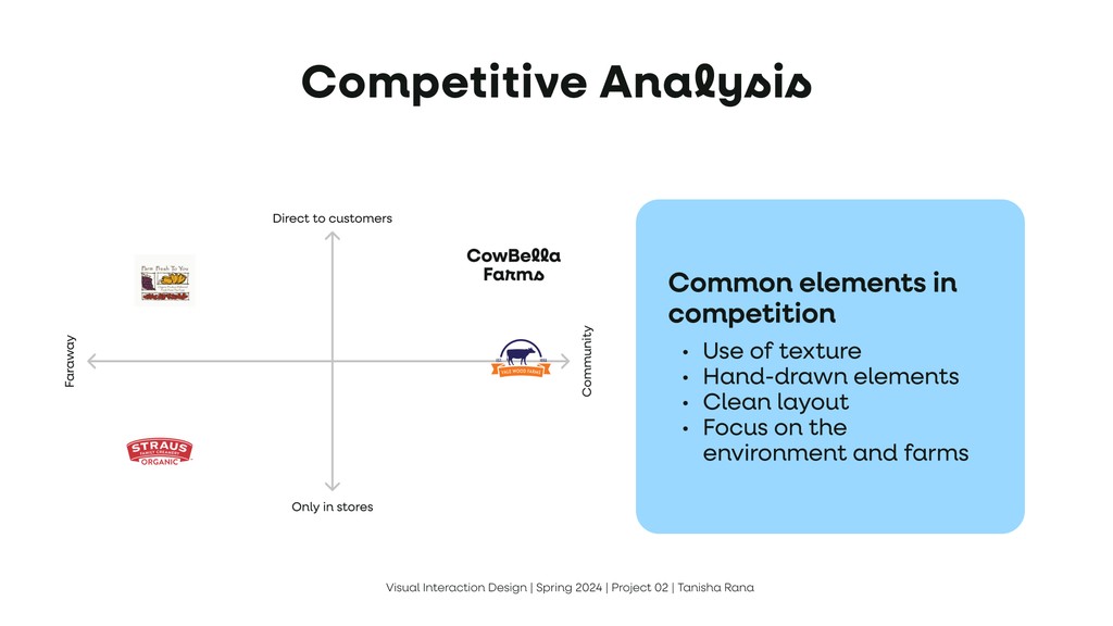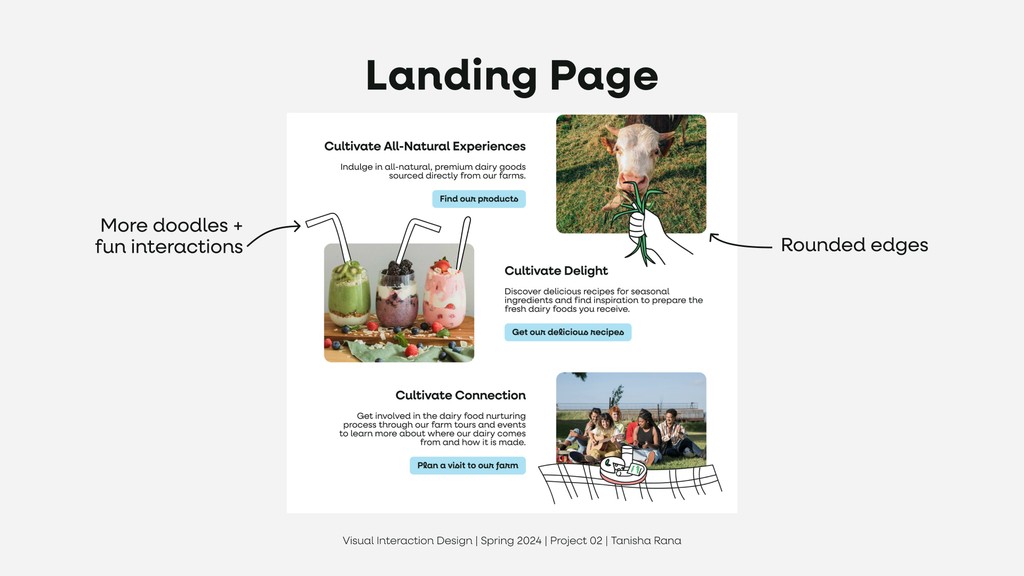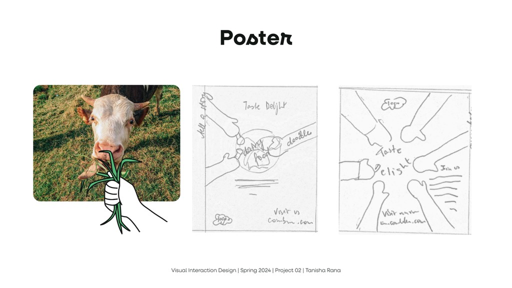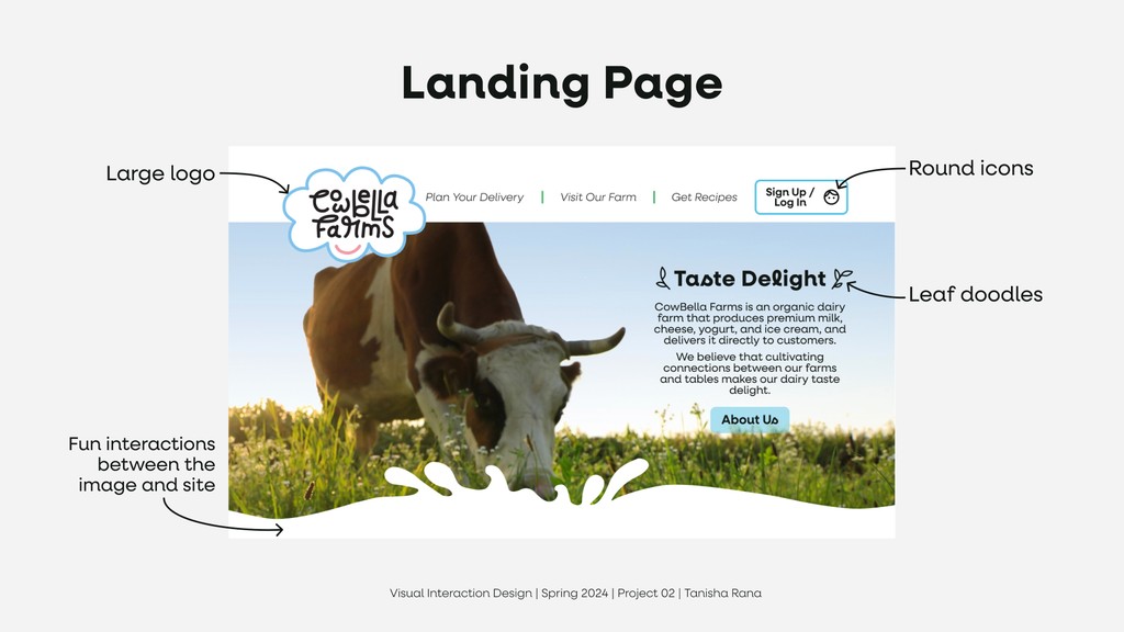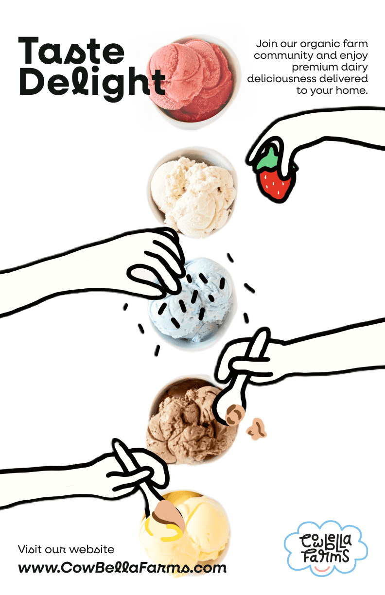 To design a new visual design system, including a logo, typography, color palette, and UI elements, that reflects CowBella Farms’ ethos of being all-natural, communal, and delightful. The goal was to ensure the brand identity resonates across various online & print channels, such as posters, mobile screens, and a website landing page.