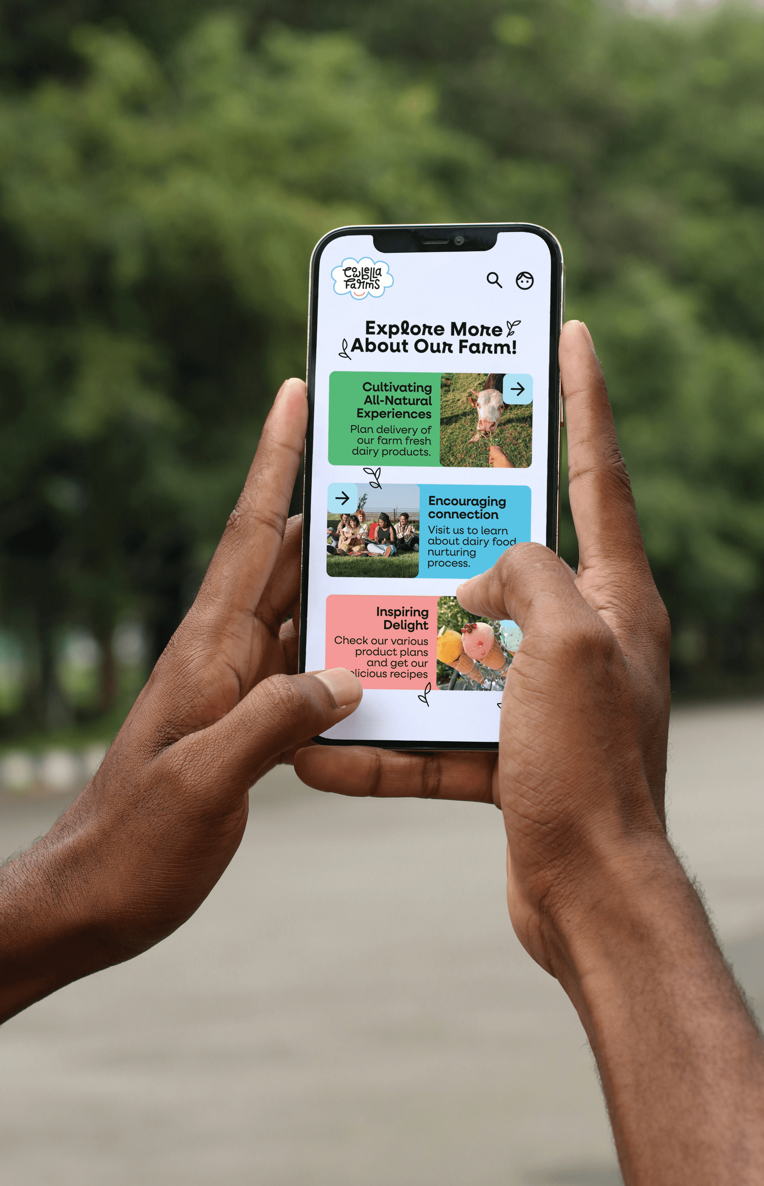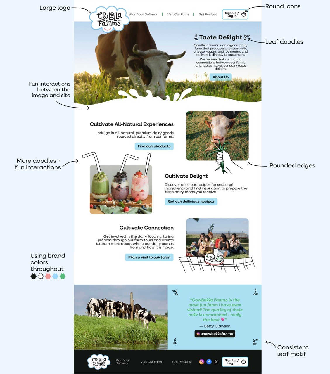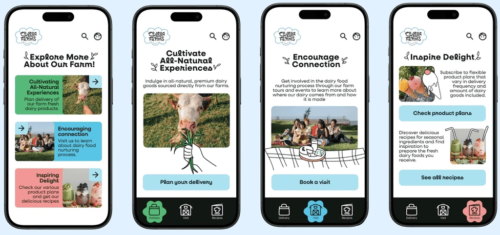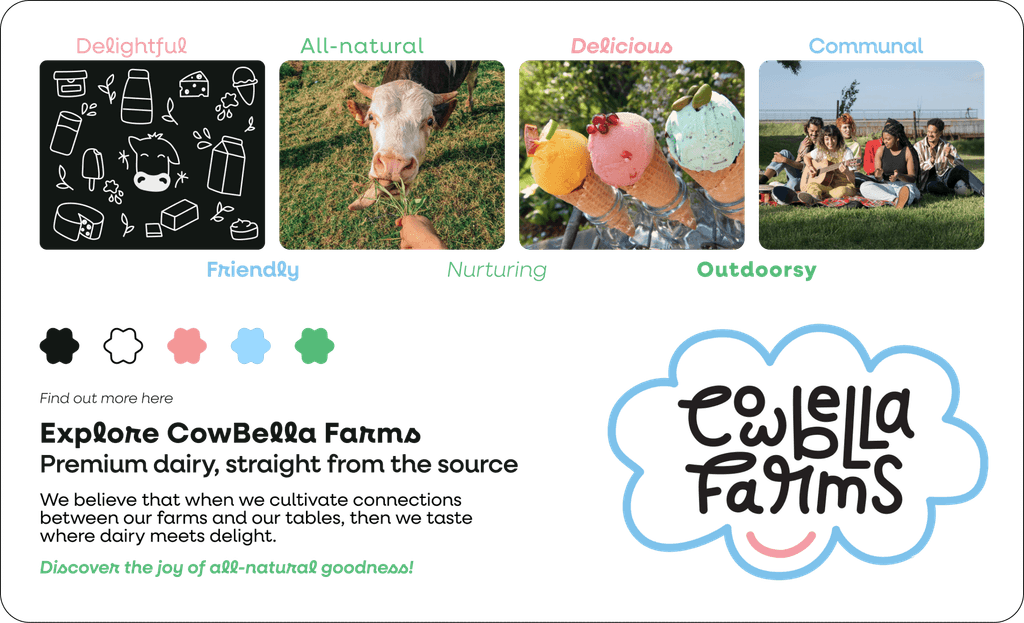 The deliverable was to design a new visual design system, including a logo, typography, color palette, and UI elements, that reflects CowBella Farms’ ethos of being all-natural, communal, and delightful. The goal was to ensure the brand identity resonates across various online & print channels, such as posters, mobile screens, and a website landing page.