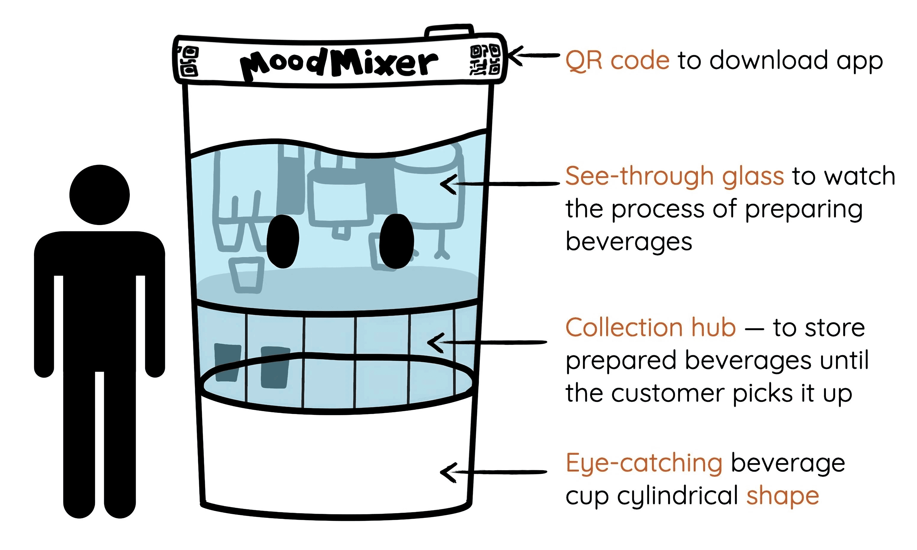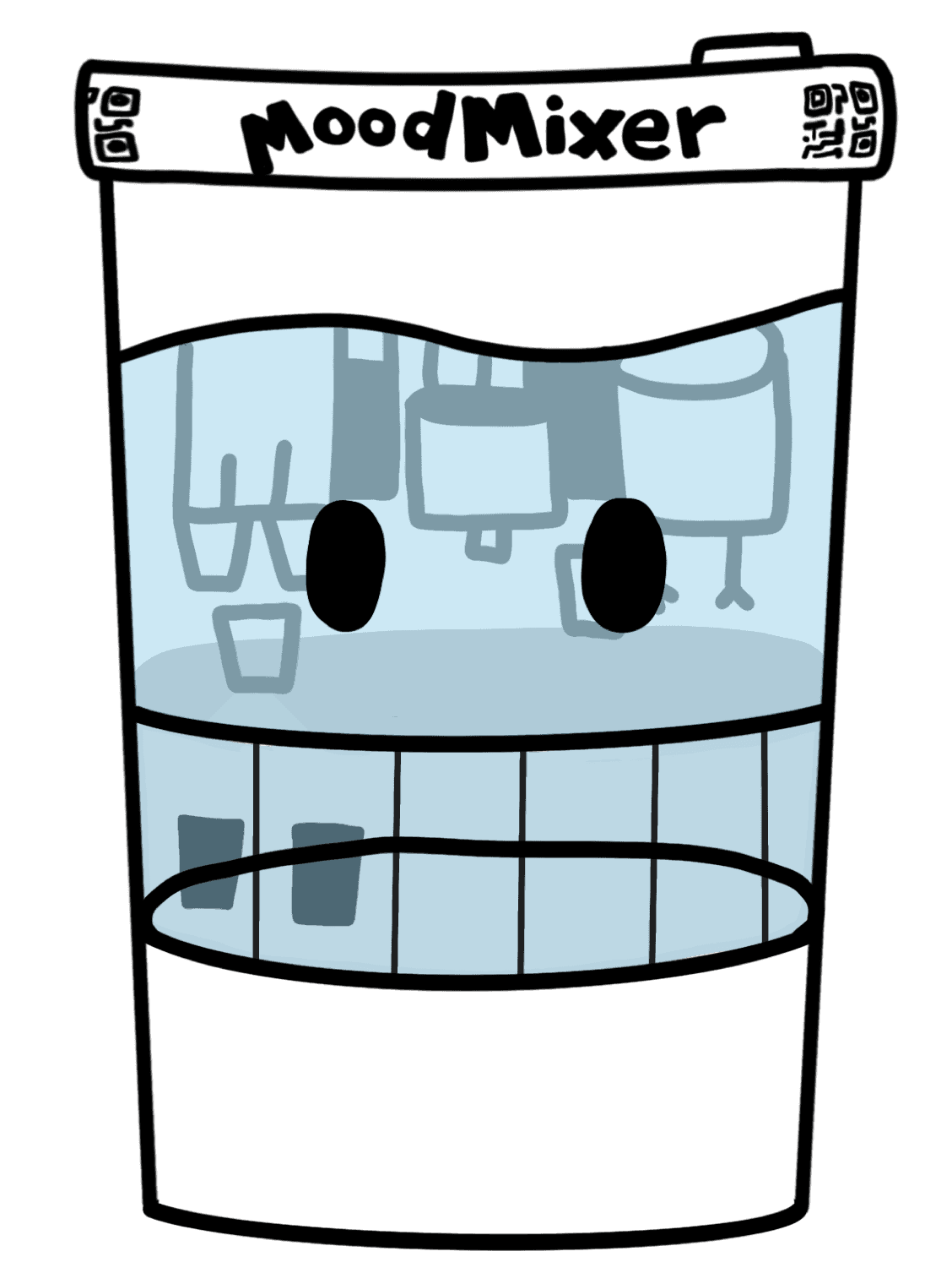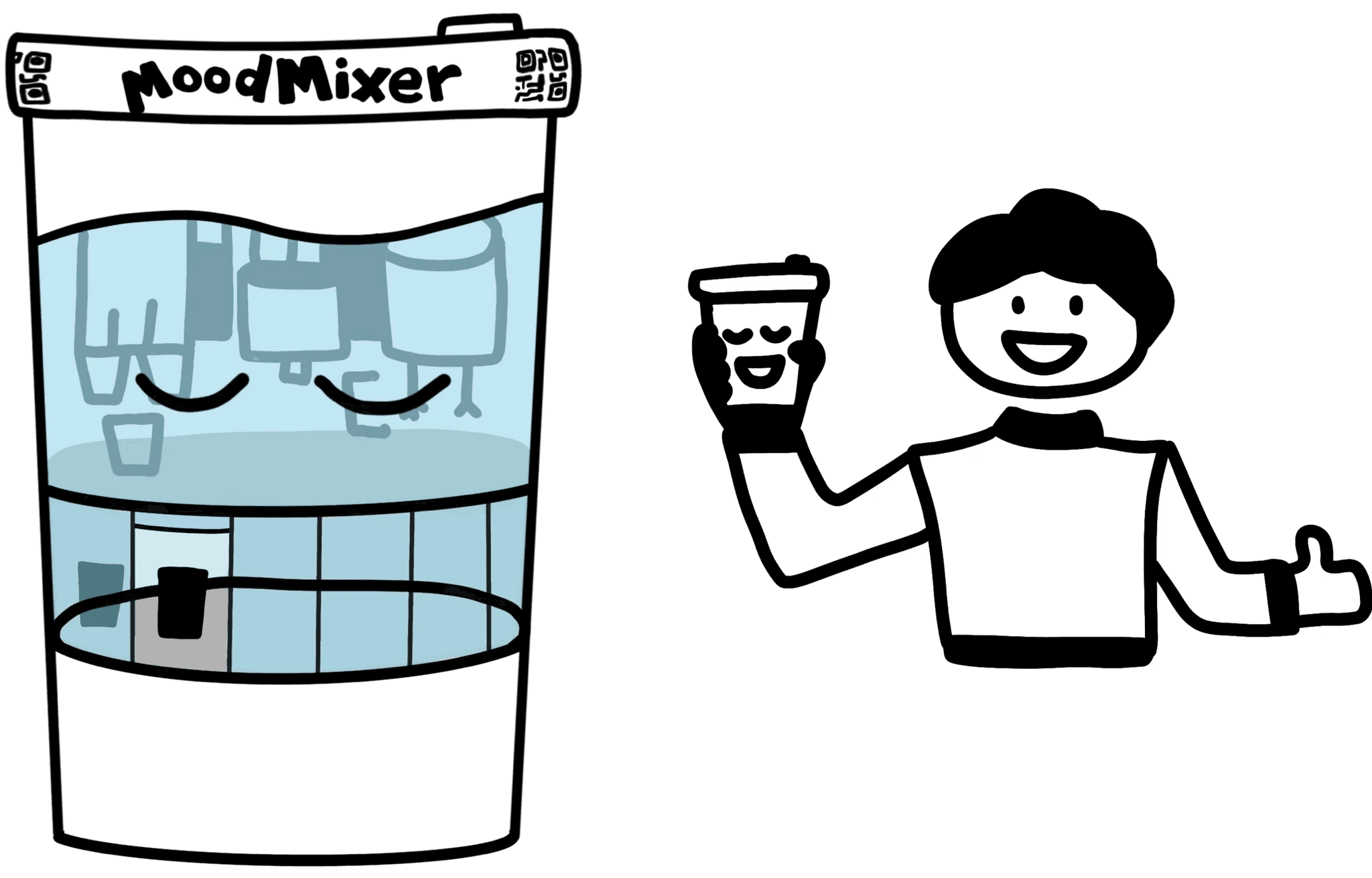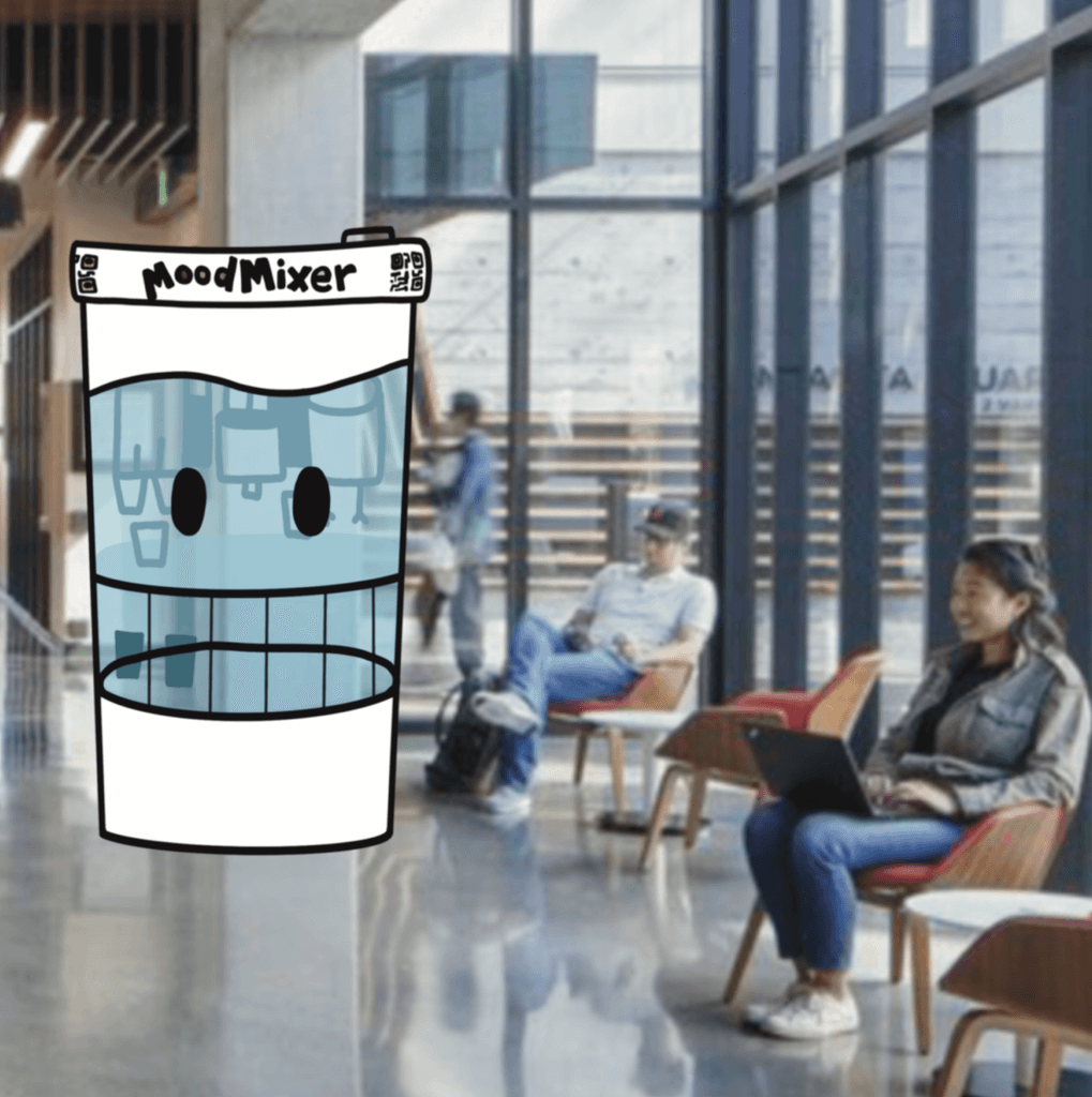 Notices a sign saying “Stressed about your project? Try MoodMixer — Sip, smile, and enjoy!”