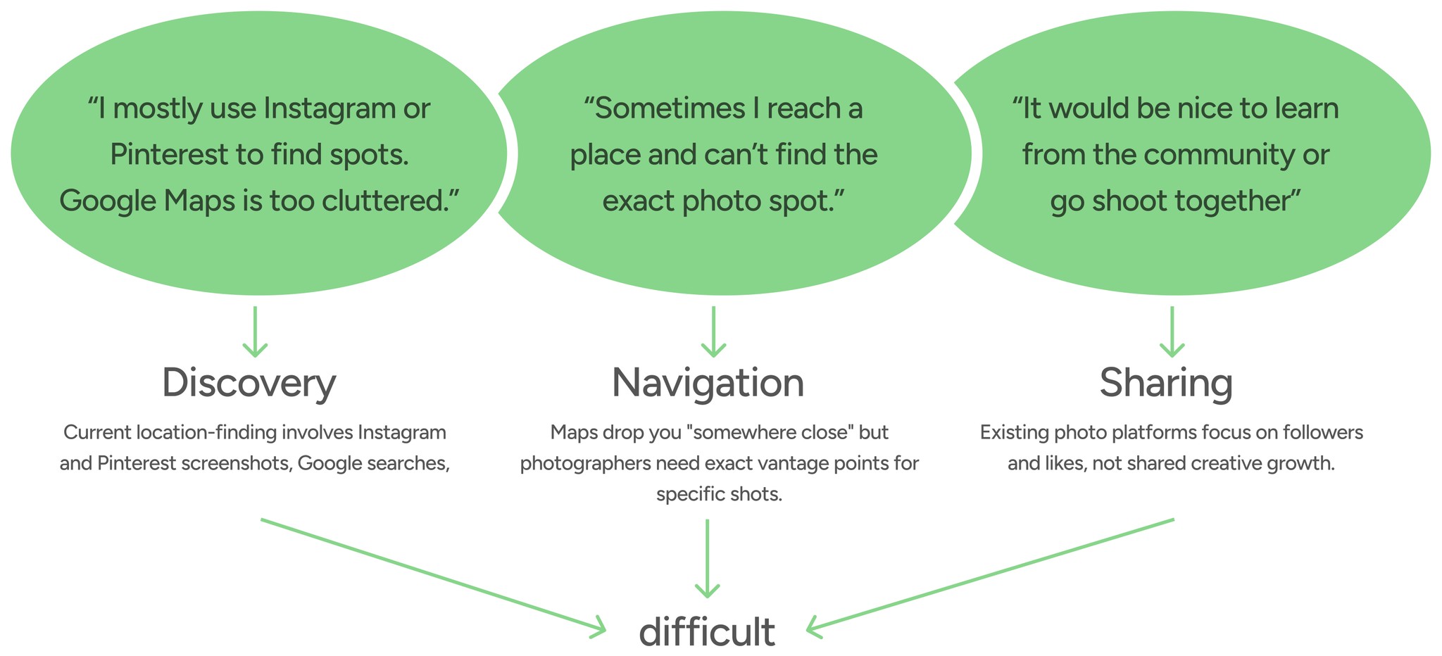 Rather than make assumptions about photographers (a group I don't relate to), I interviewed 3 photography enthusiasts to understand their location-finding process. The struggles were universal: